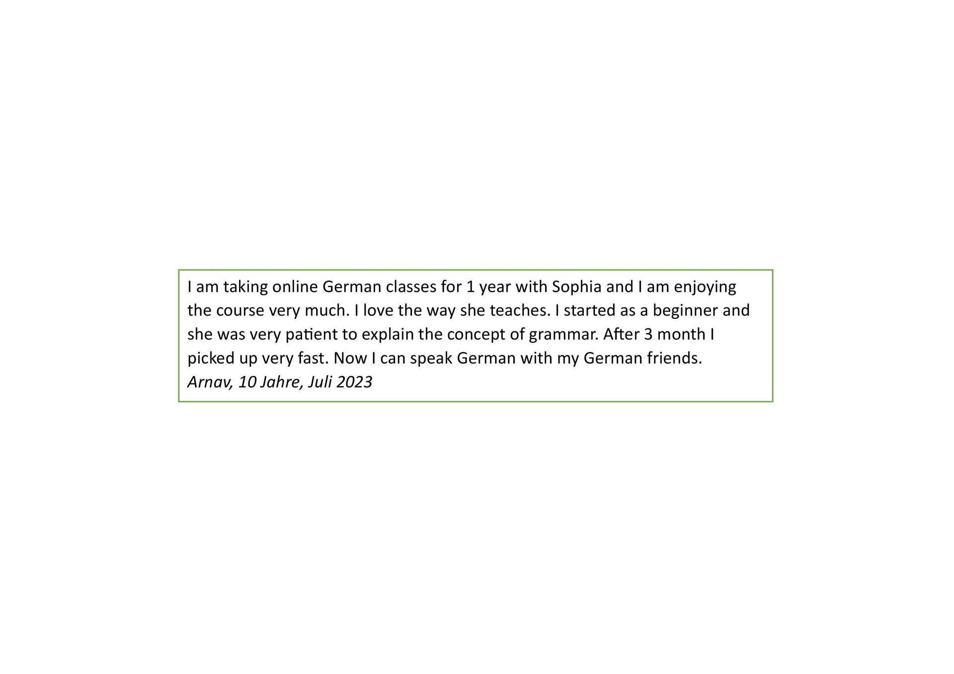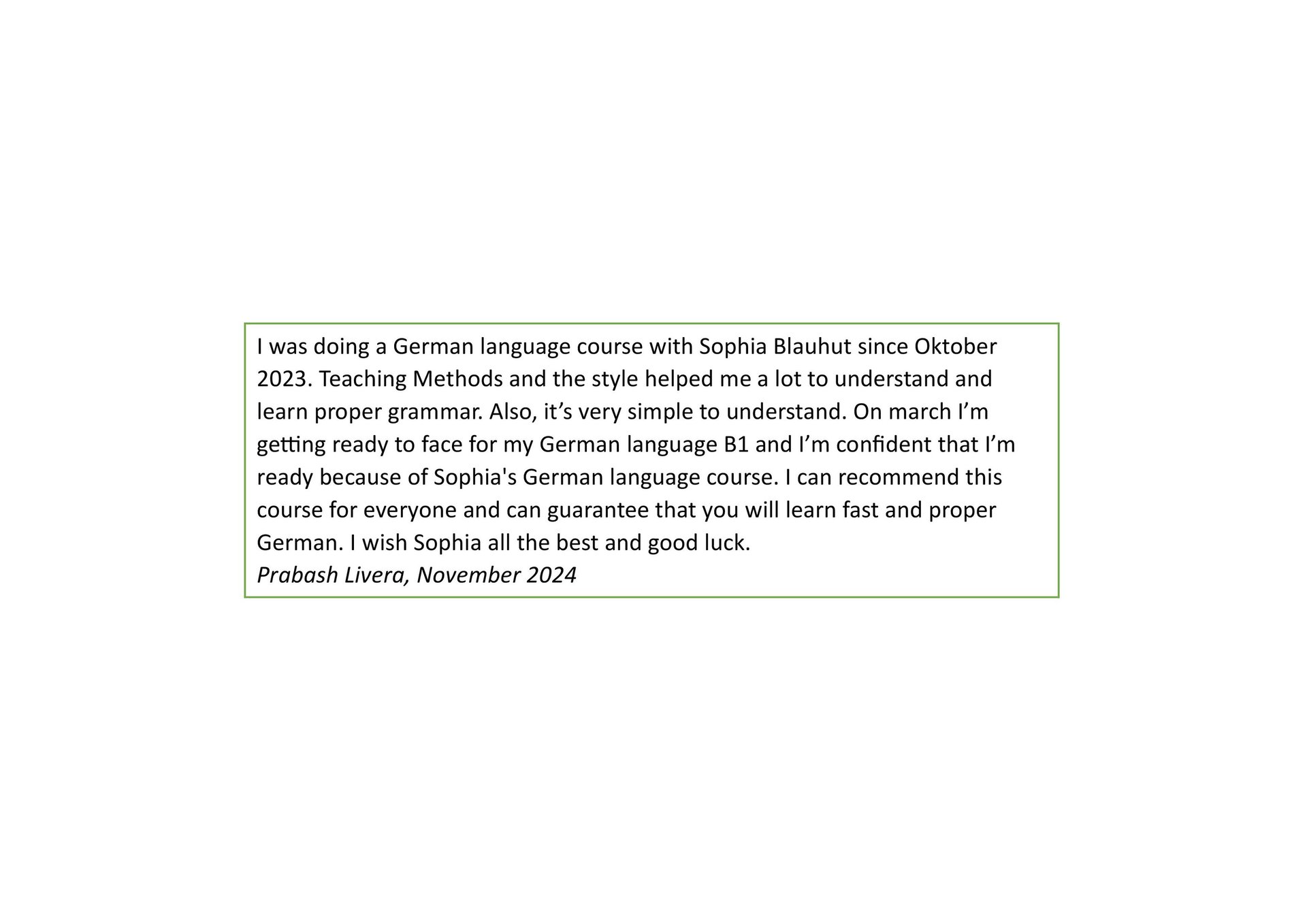 I was doing a German language course with Sophia Blauhut since Oktober 2023. Teaching Methods and the style helped me a lot to understand and learn proper grammar. Also its very simple to understand. On march im getting ready to face for my German language B1 and im confident that im ready because of Sophia's German language course. I can recommend this course for everyone and can guarantee that you will learn fast and proppr German. I wish Sophia all the best and good luck.