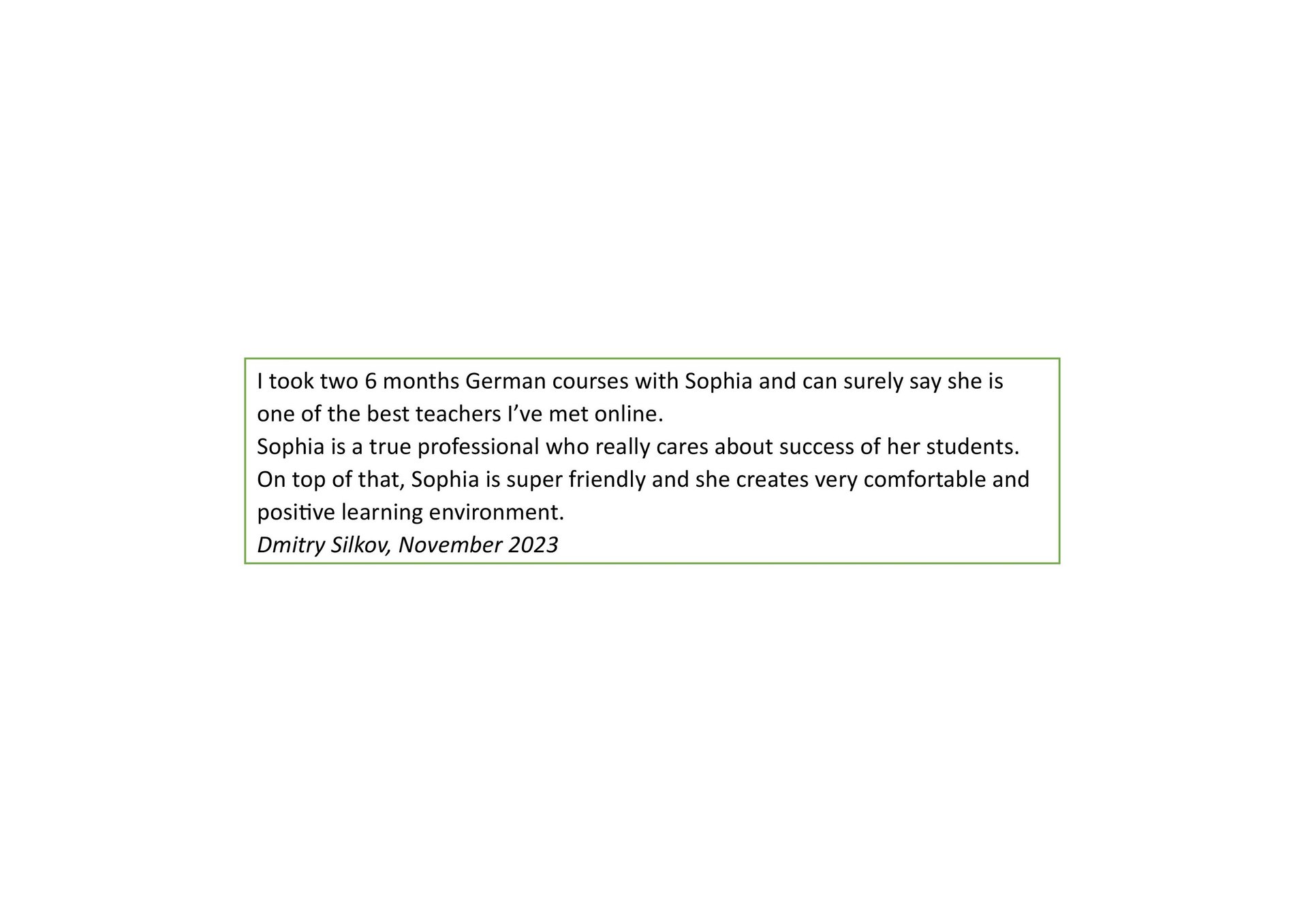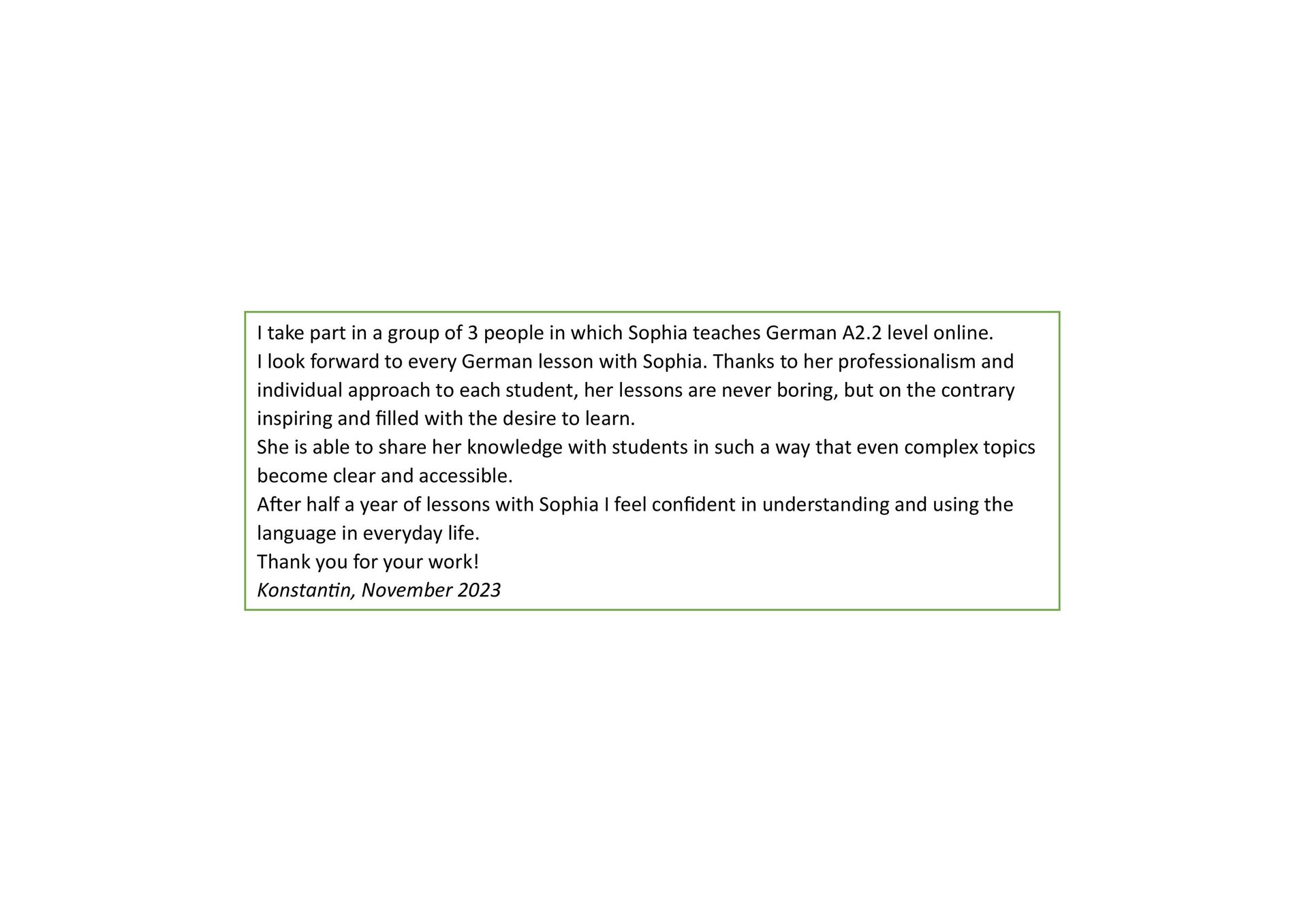 I look forward to every German lesson with Sophia. Thanks to her professionalism and individual approach to each student, her lessons are never boring, but on the contrary inspiring and filled with the desire to learn.