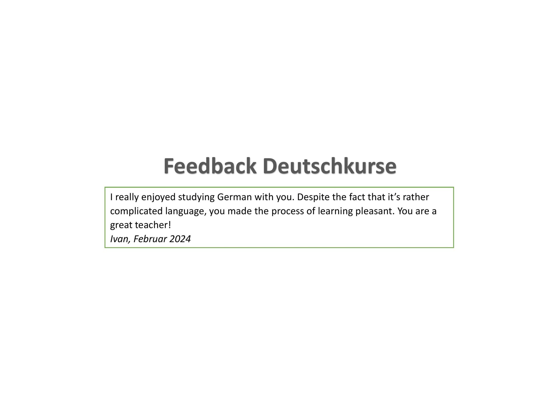 I really enjoyed studying German with you. Despite the fact that it’s rather complicated language, you made the process of learning pleasant. You are a great teacher!