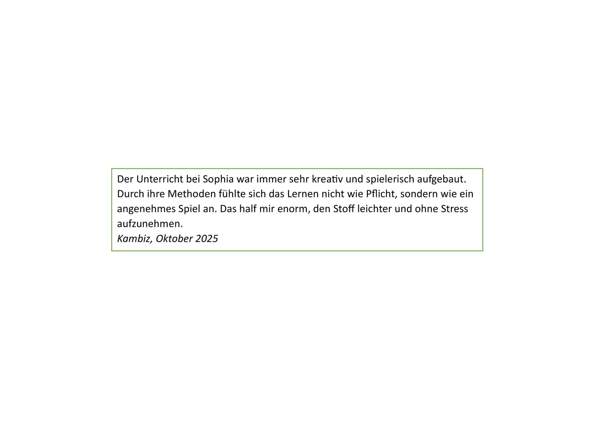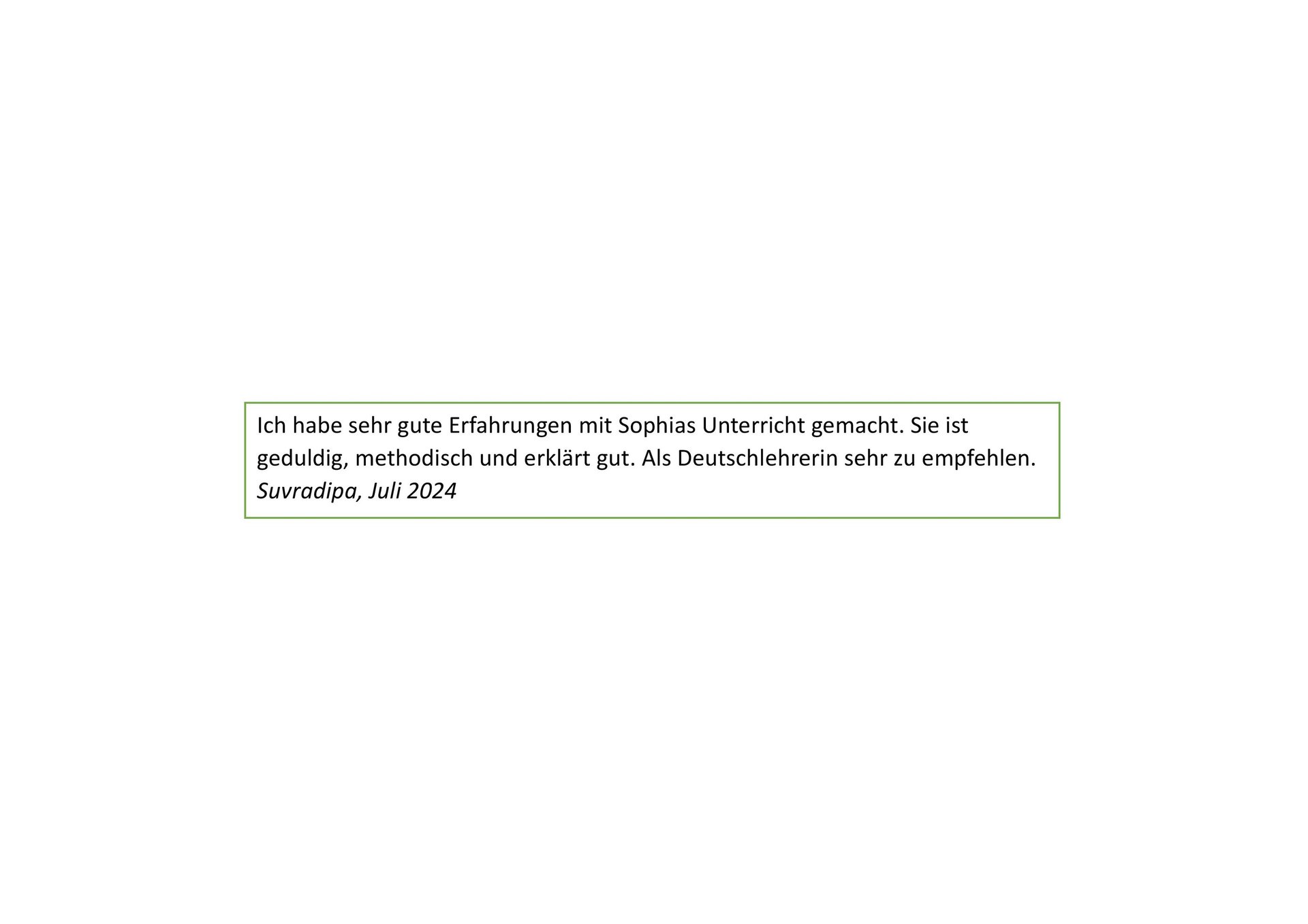 Ich habe sehr gute Erfahrungen mit Sophias Unterricht gemacht. Sie ist geduldig, methodisch und erklärt gut. Als Deutschlehrerin sehr zu empfehlen.